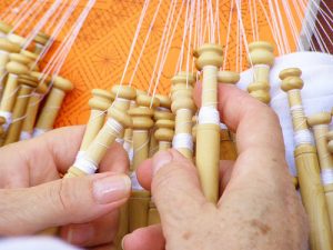 Il tombolo d’Abruzzo è un merletto lavorato su un cuscino con i cosiddetti “fuselli”, che sono bastoncini di legno attorno ai quali si avvolge il filo.